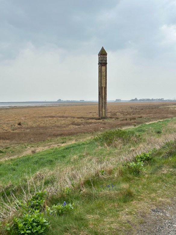 Fortunately, just after the Point of Comfort (how apt) we are able to leave the road and walk along a concrete walkway, away from the traffic. This then takes us up onto a minor road and past the village of Rampside where a tall tower rises up from the marshy beach. Known locally as The Needle, this lighthouse was one of thirteen beacons built in the late nineteenth century to aid navigation into the port of Barrow in Furness.