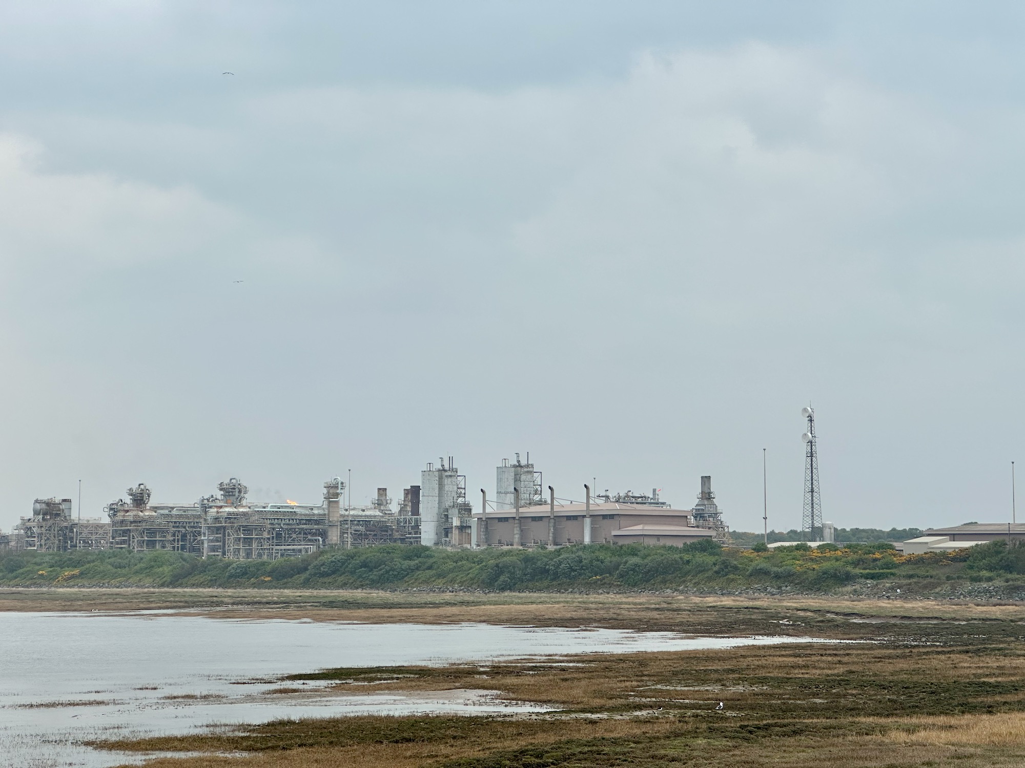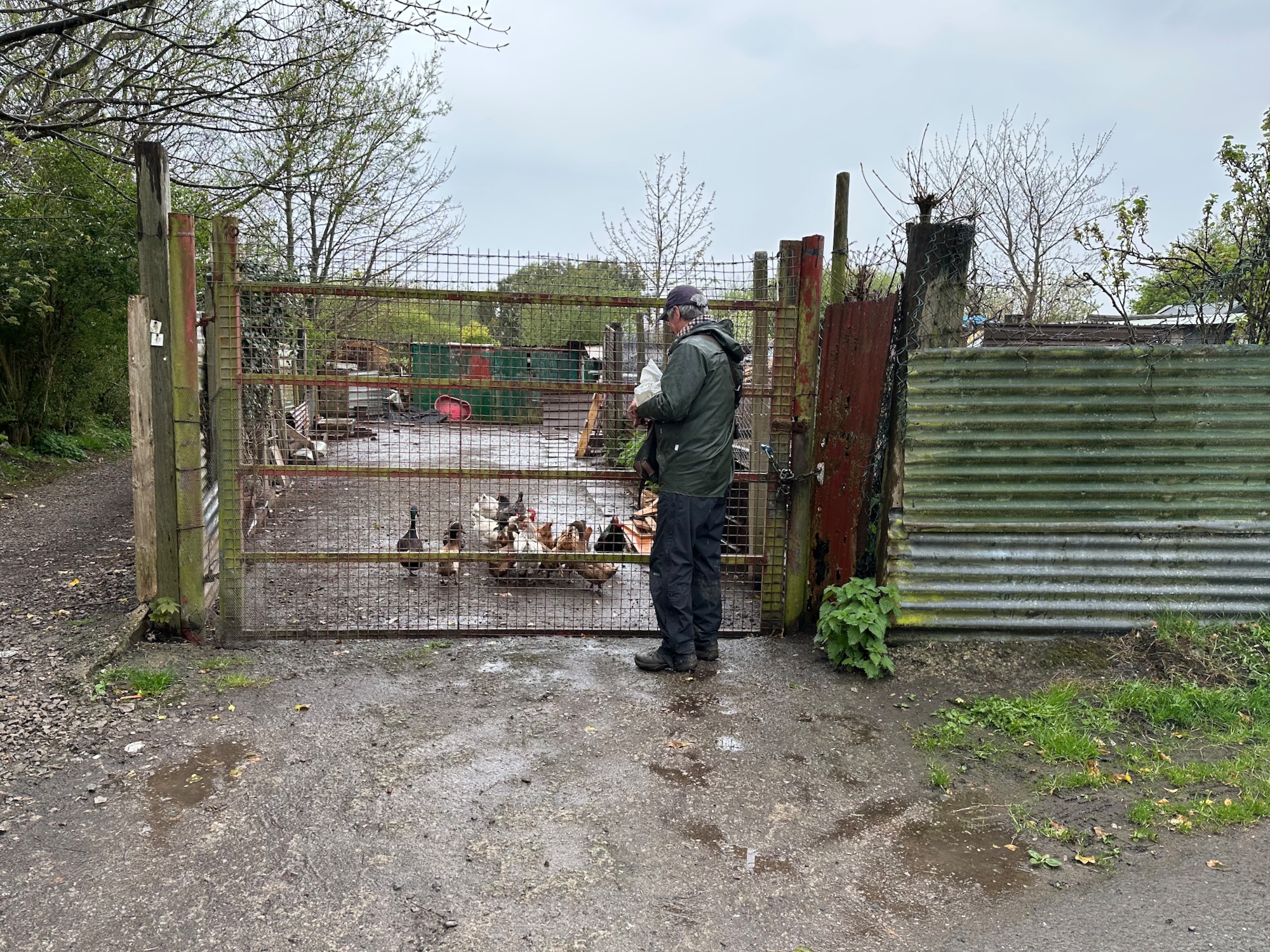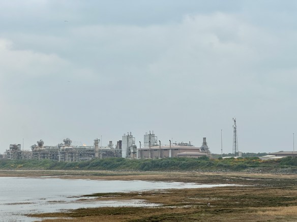We are now following a cycle route first across farmland and then along the edge of a muddy bay called Roosecote Sands. The path runs past gas terminals, flare stacks and a sewage works to end up taking us through an area of allotments where a brood of chickens finish off the rest of our lunch.