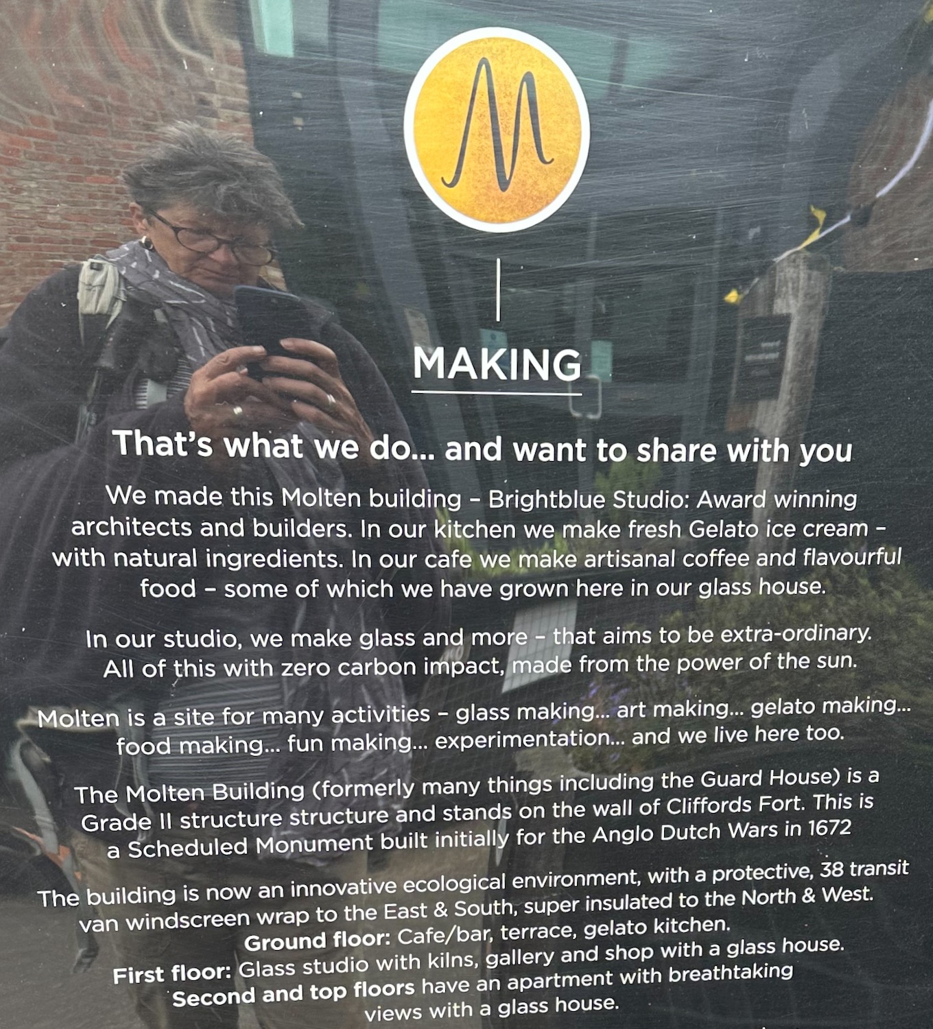 Highlights for me….. the coffee in the Molten Building and the chance to chat to its creator” I know what we’ll do, we’ll glaze it with Transit van windscreens…”. Now that is thinking out of the box?