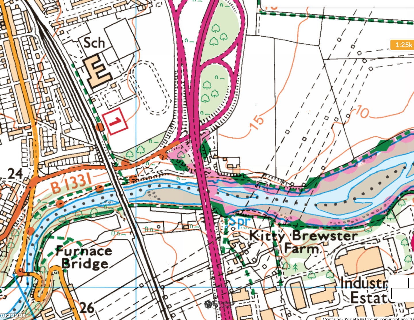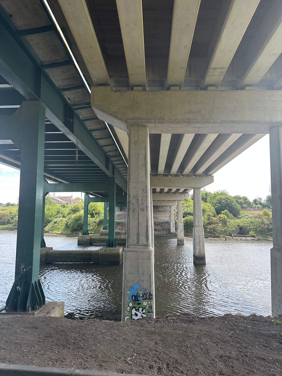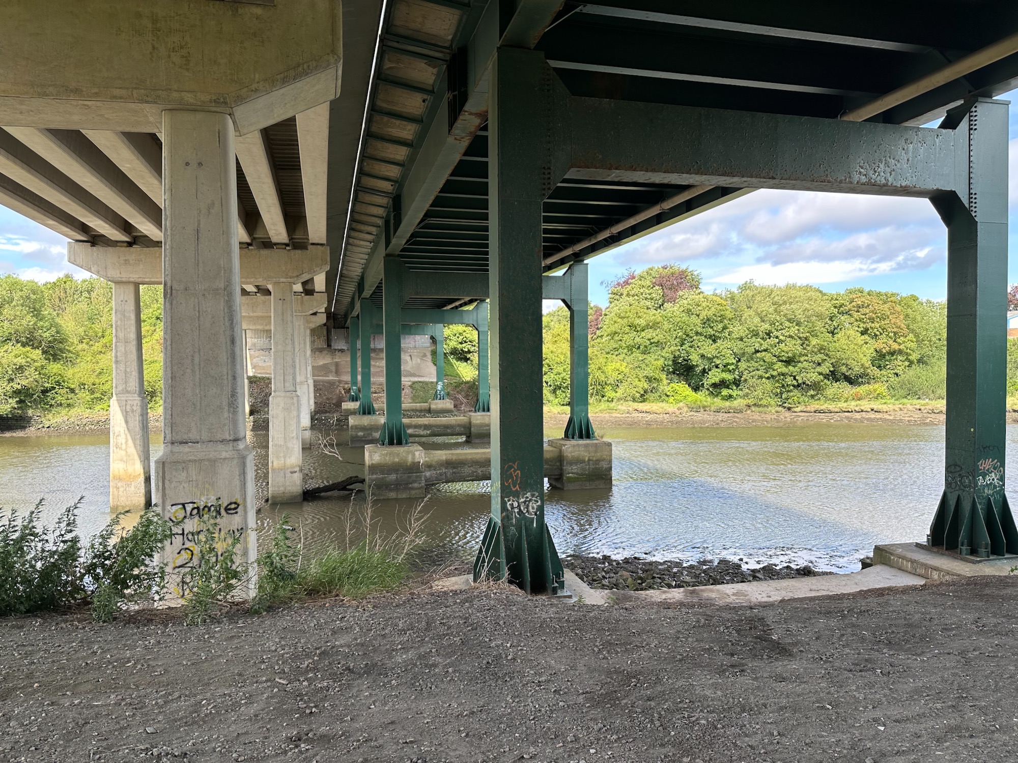 We hear it before we see it – a continuous stream of traffic thundering across the bridge. Walking underneath the pillars we miss the turning which would have taken us up onto the bridge. I am quietly relieved as we find the alternative route, under the railway bridge and onto the much quieter Furnace Bridge for pedestrians and cyclists.