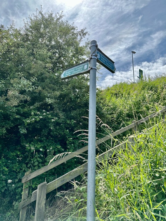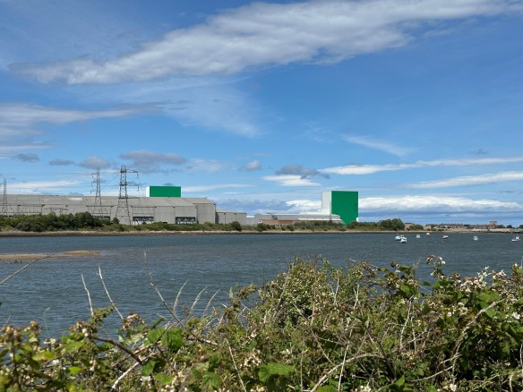 About a mile up the beach the path turns off inland to avoid the Blyth estuary ,and leads us onto a minor road, flanked on both sides by dreary faceless industrial buildings. It is very hot as we trudge along the tarmac and the only thing that manages to catch my eye is the bright turquoise facades of two mammoth, windowless buildings. I later discover that the whole site is part of a 130 million pound manufacturing facility for the production of high voltage subsea cables for offshore wind farms. That’s good news…………