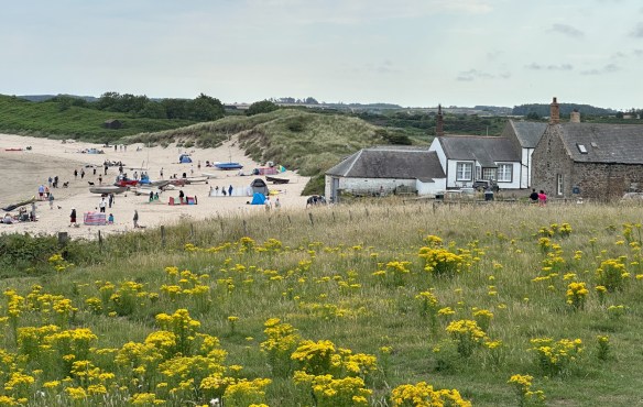 Still on St.Oswald’s Way we round Newton Point and soon we are looking down on the beach at Low Newton. Here the beach is busy – why? There is an access road, a carpark , a shop and a pub with the most delicious lager.