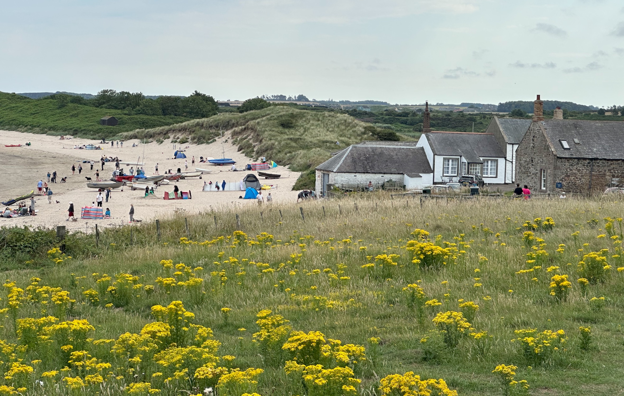 Still on St.Oswald’s Way we round Newton Point and soon we are looking down on the beach at Low Newton. Here the beach is busy – why? There is an access road, a carpark , a shop and a pub with the most delicious lager.