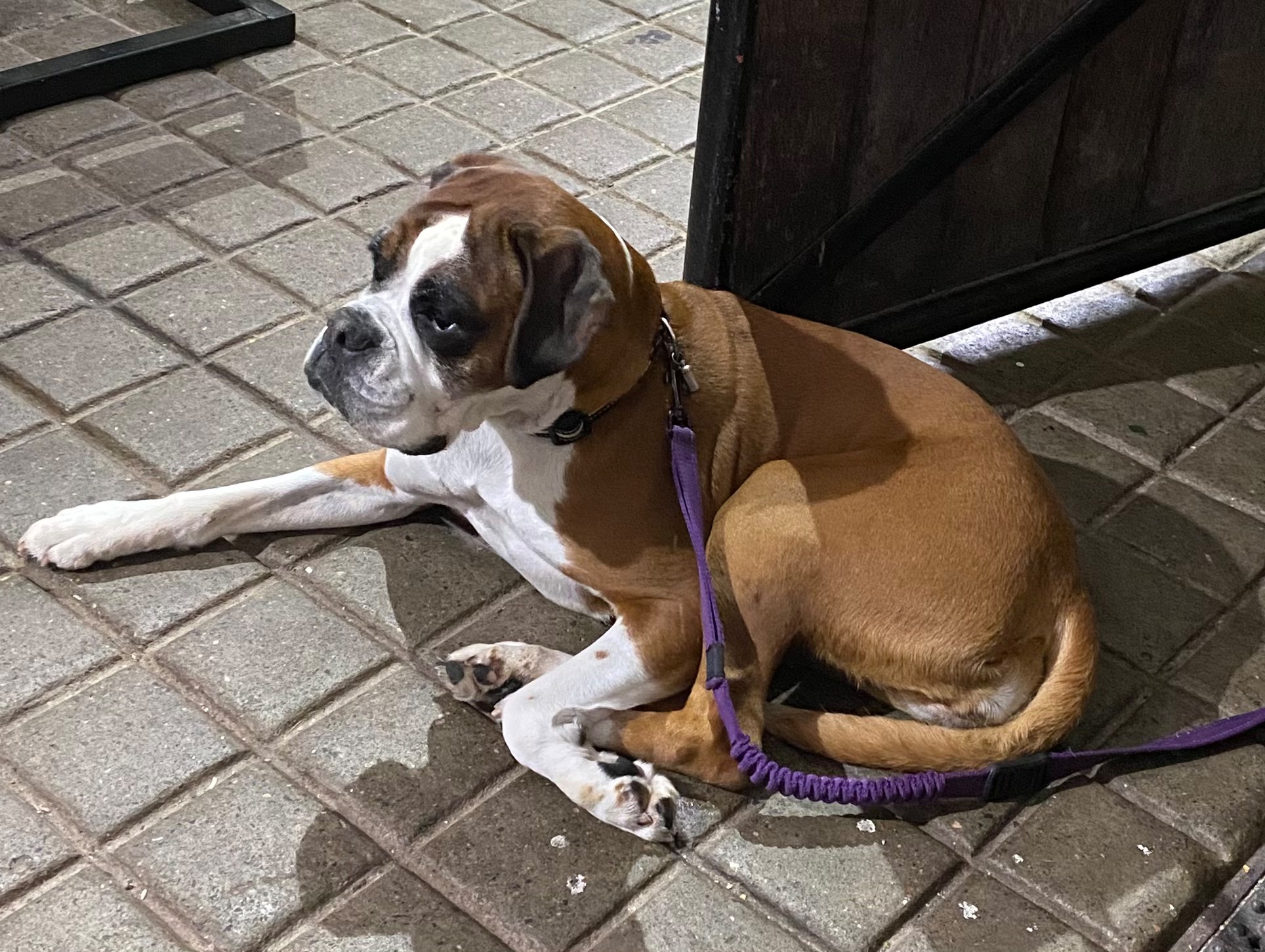 It is still raining so we go down to the converted stables for a cup of tea. In the next stall, a beautiful boxer with a stern gaze surveys the scene.