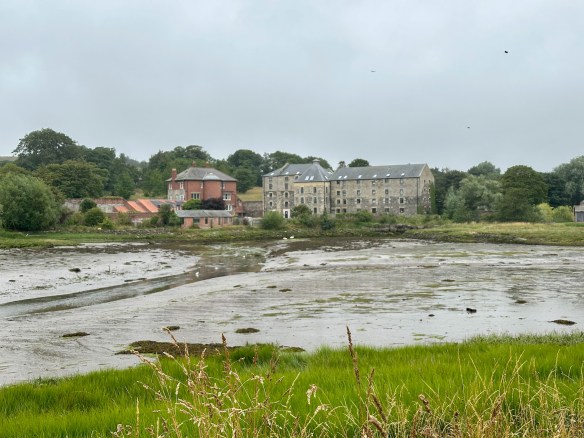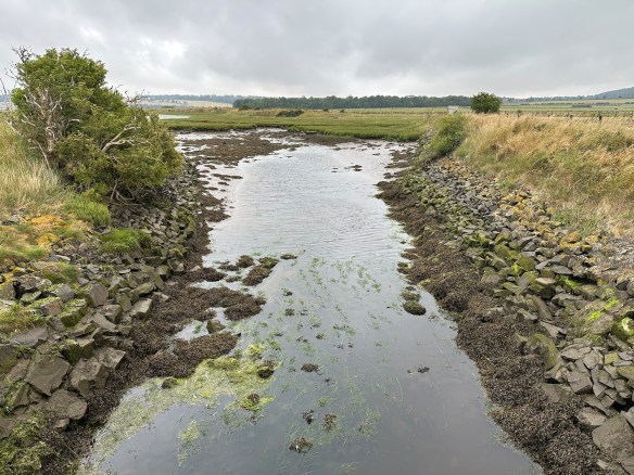 At Warren Mill the map indicates a short inland loop to avoid the narrow road over a bridge – we decide to risk it. There is now a short stretch of tarmac as we follow the road up the eastern side of the bay, until we turn off onto a quiet path. Despite the grey day there are some magnificent views across the sands.
