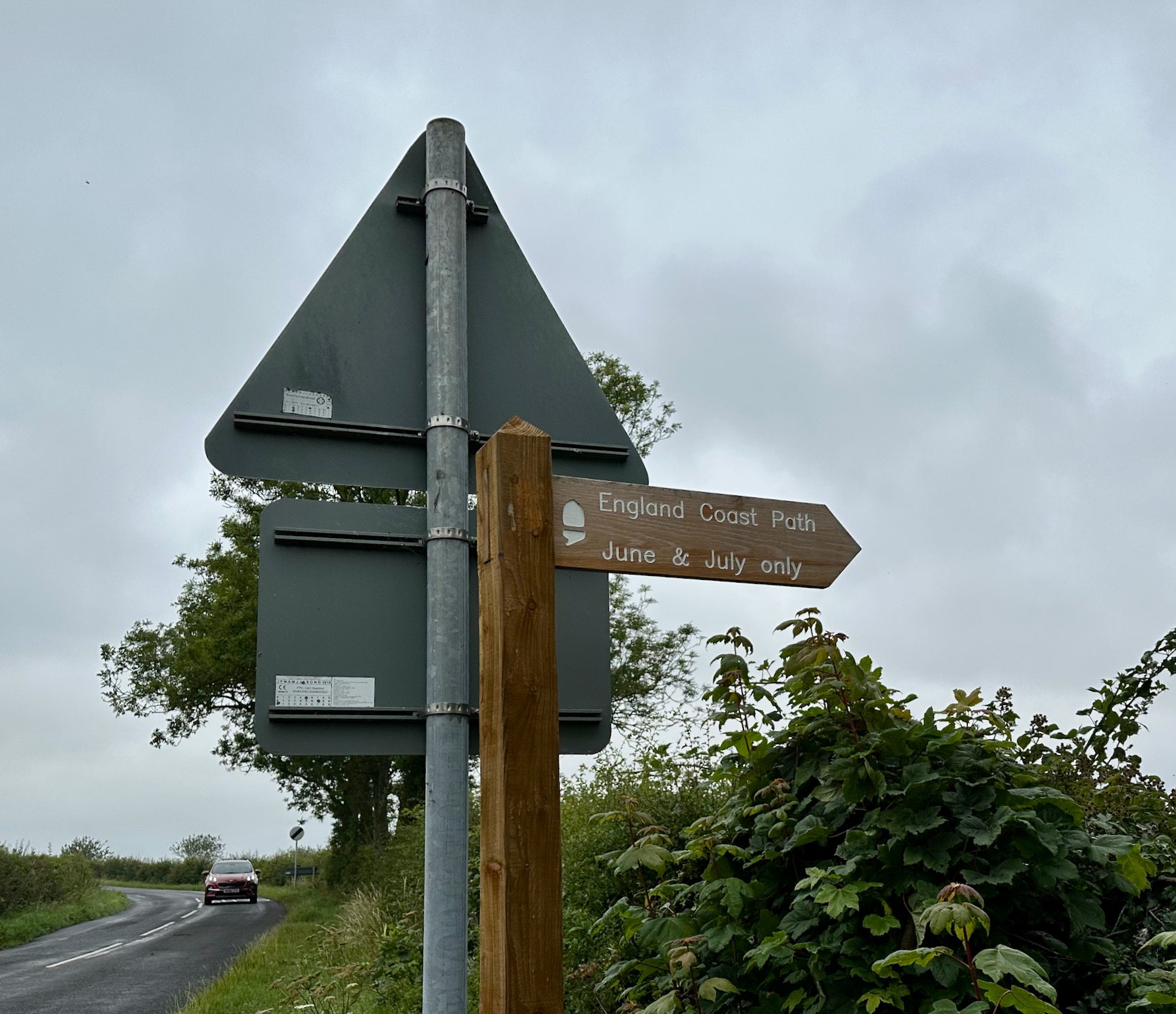 Coming out on to a road I notice that the coast path sign has an interesting addition – only accessible in June and July due to sensitivity around coastal birds – we have been lucky.