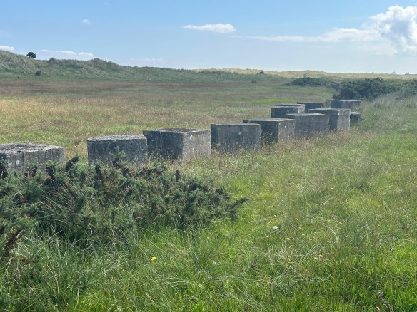 Reunited we carry on through the dunes – there are lots of small paths and it’s potluck which one we follow as long as it’s going in the right direction. The usual remnants of military defences line the path.