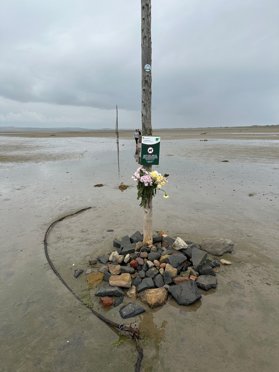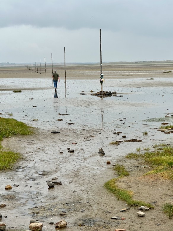 After sharing our breakfast with the birds, we head down to the causeway – it is low tide so we walk out past a few of the long guidance poles just to get an idea of what it feels like – damp.