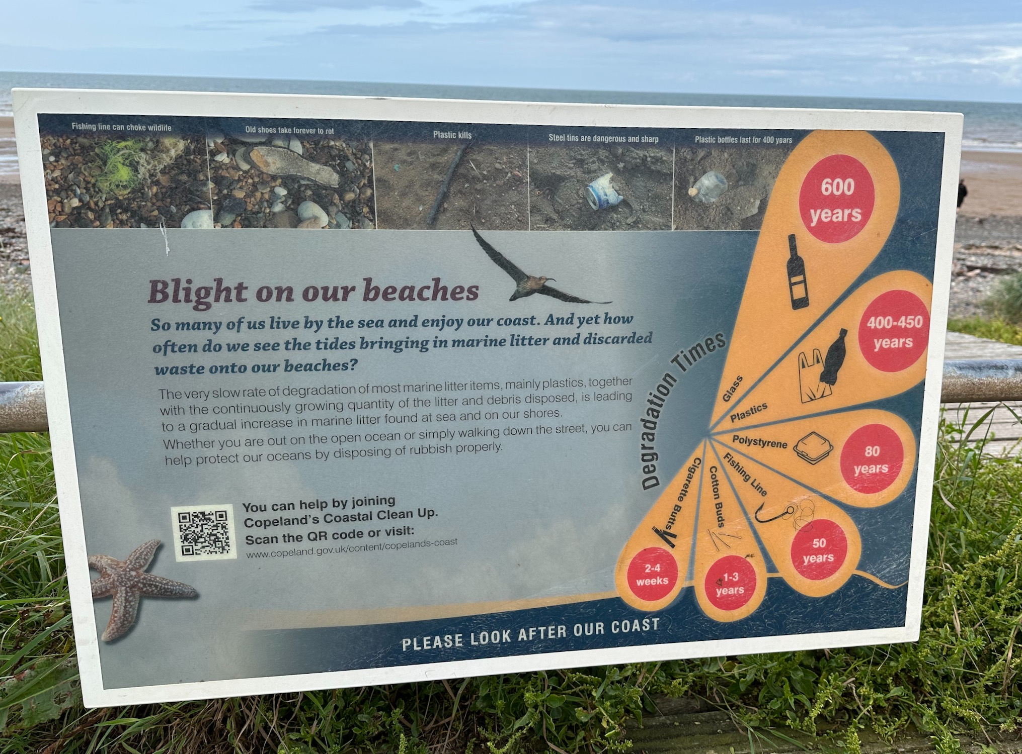 We find nowhere for a cup of tea so we carry on, passing a public information board with warnings of the environmental damage caused by marine litter – I am surprised to read that it takes 600 years for a glass bottle to disappear.