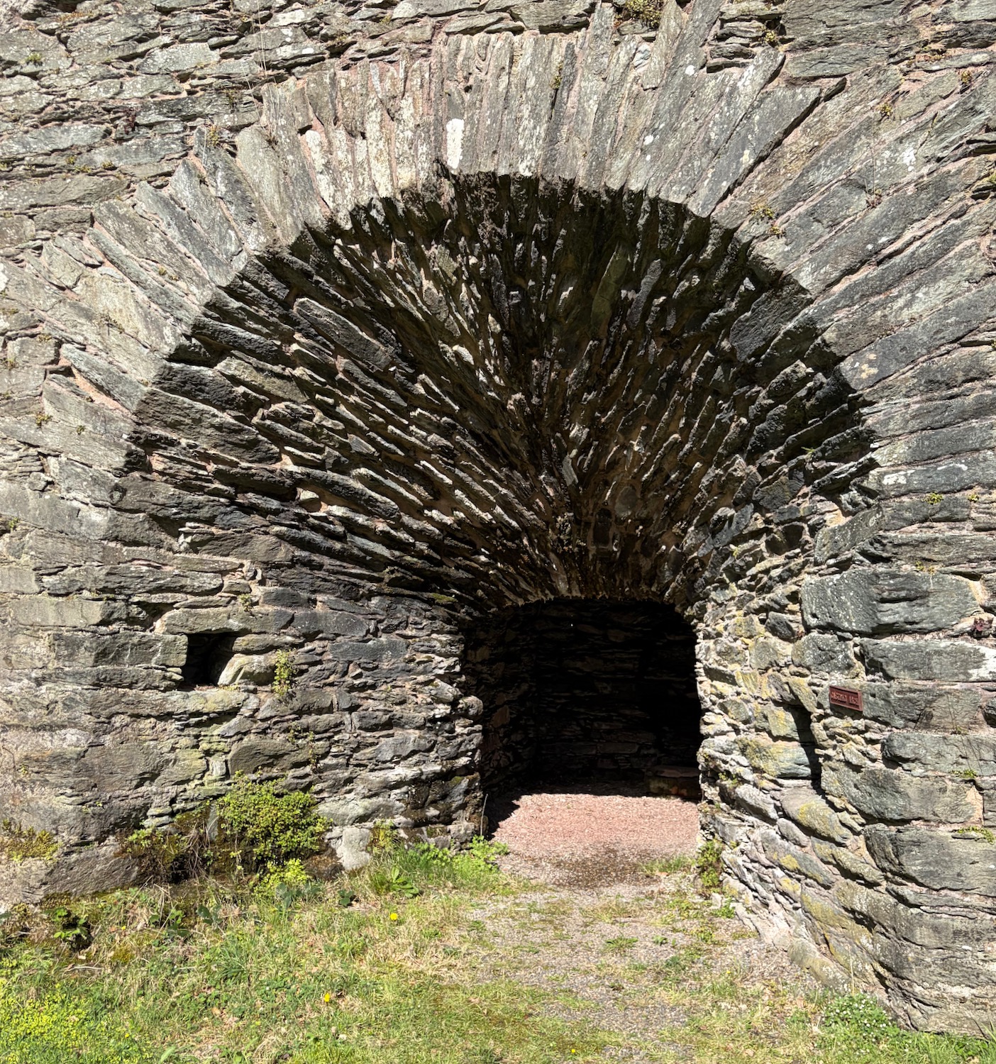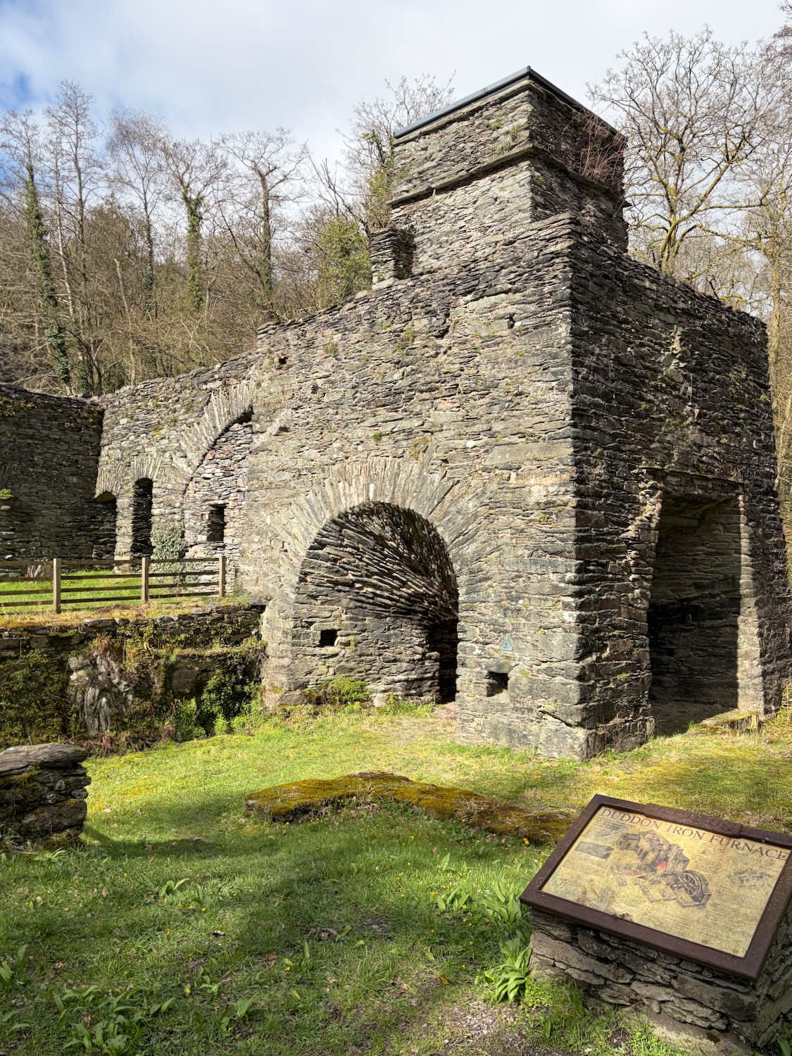 At Duddon Bridge we turn off right on to a minor road and then left into an area of woodland. Off to our right stand the restored ruins of Duddon Ironworks, an 18th century blast furnace using local charcoal and water power from the River Duddon .