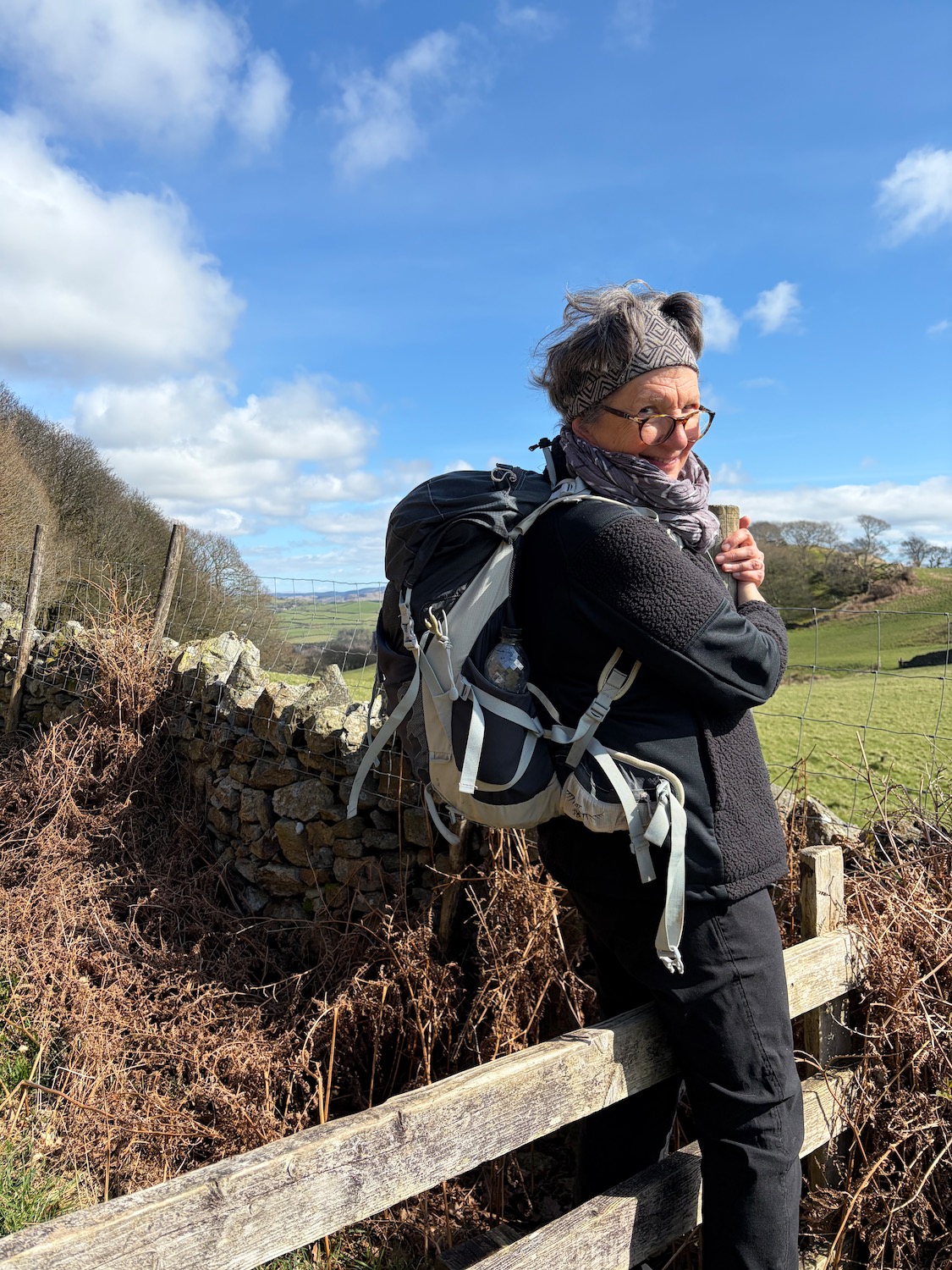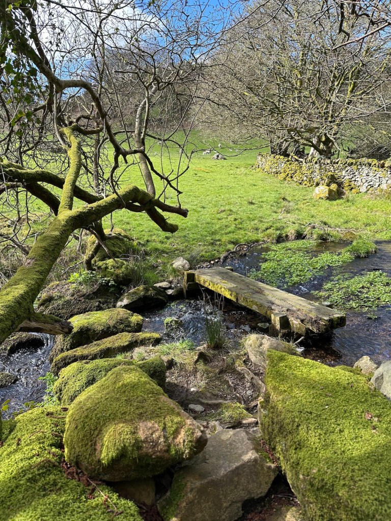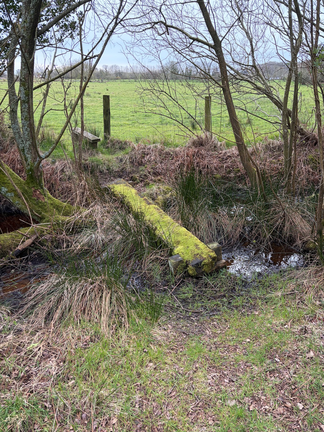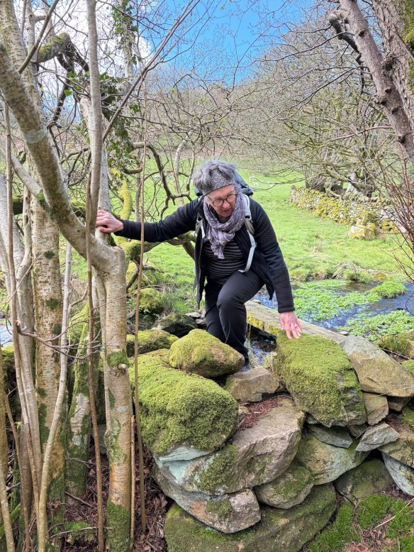 There is a footbridge (or a plank) over a muddy stream and a stone wall to climb – all fun.