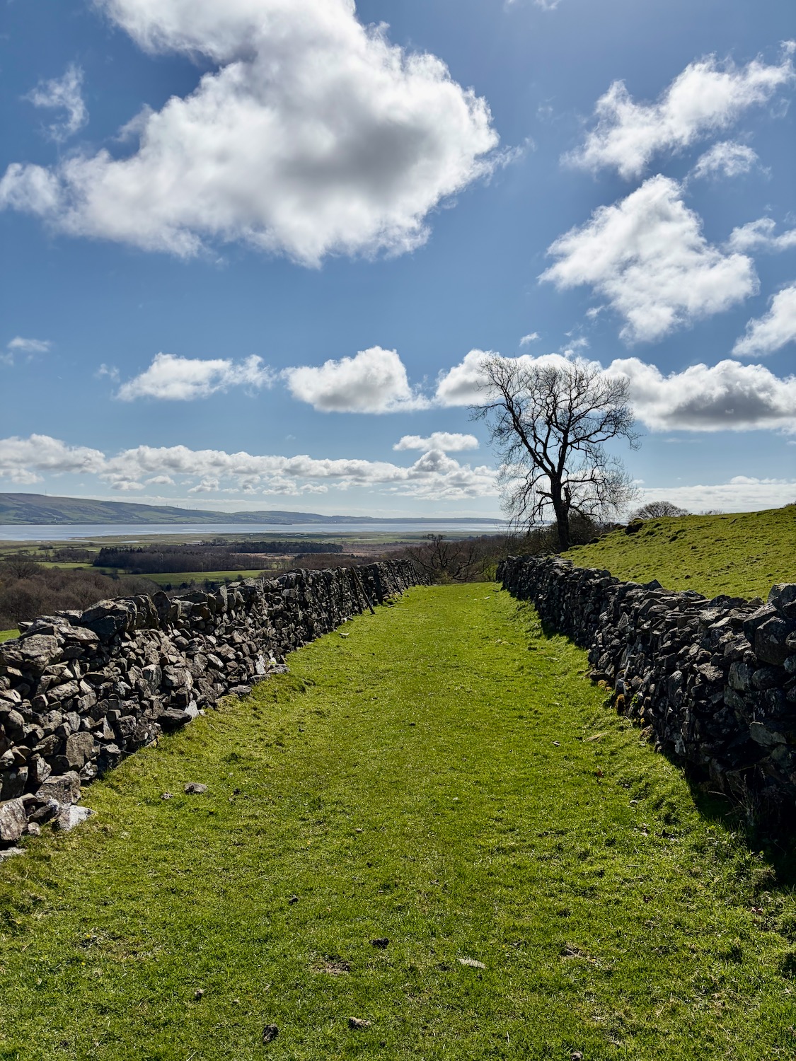 Out of the village we walk along the thankfully quiet A595 until a public footpath turns us left onto a wide grassy path down to the tip of the estuary.
