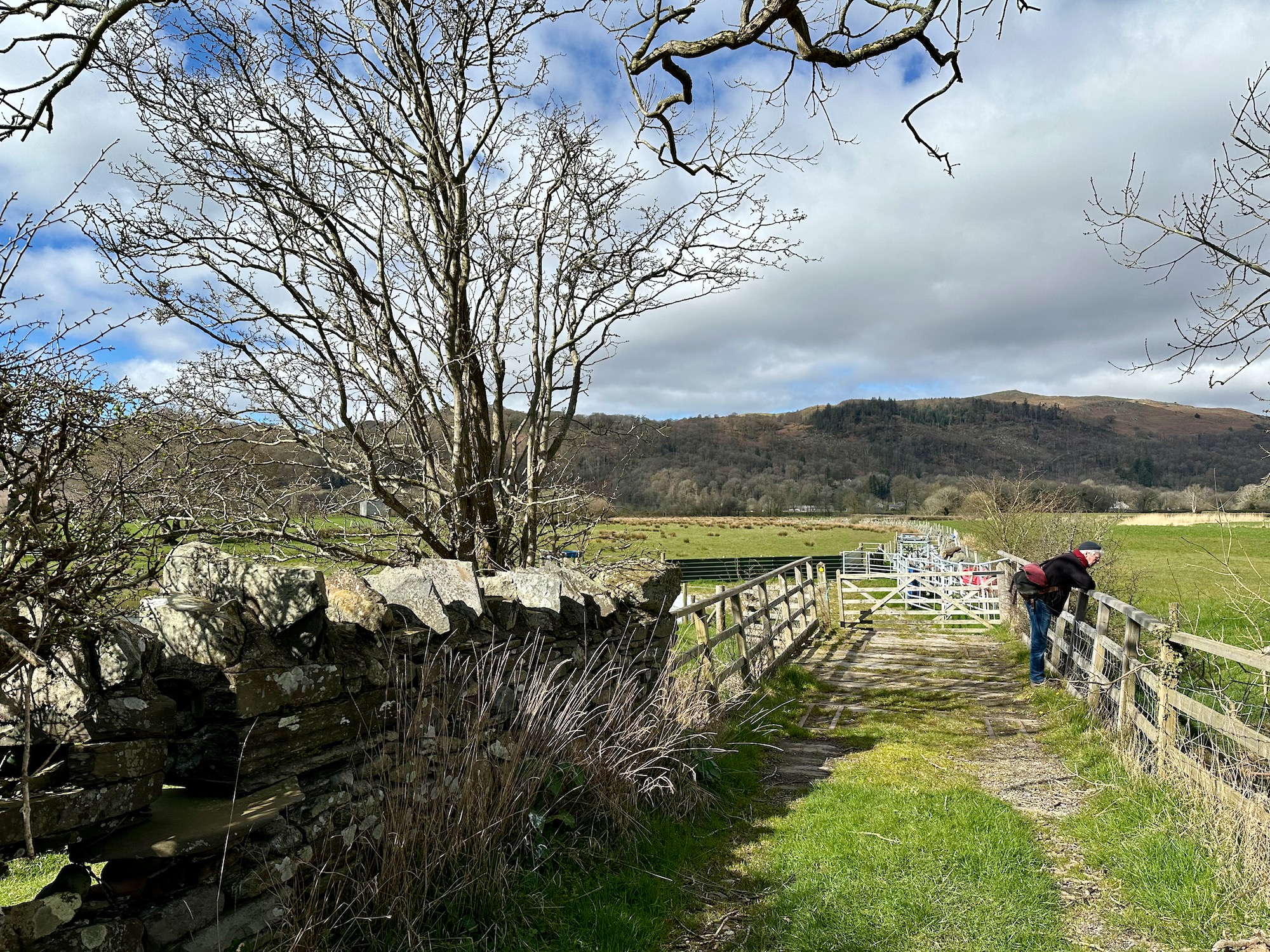 Up and up we go until the path narrows and eventually disappears – but not for long. At this point it looks like we may have to climb a barbed fence into a field but just as I begin girding my loins (click and see how) I catch sight of a faint narrow path off to the left which will take us over a gate and back down to the road.