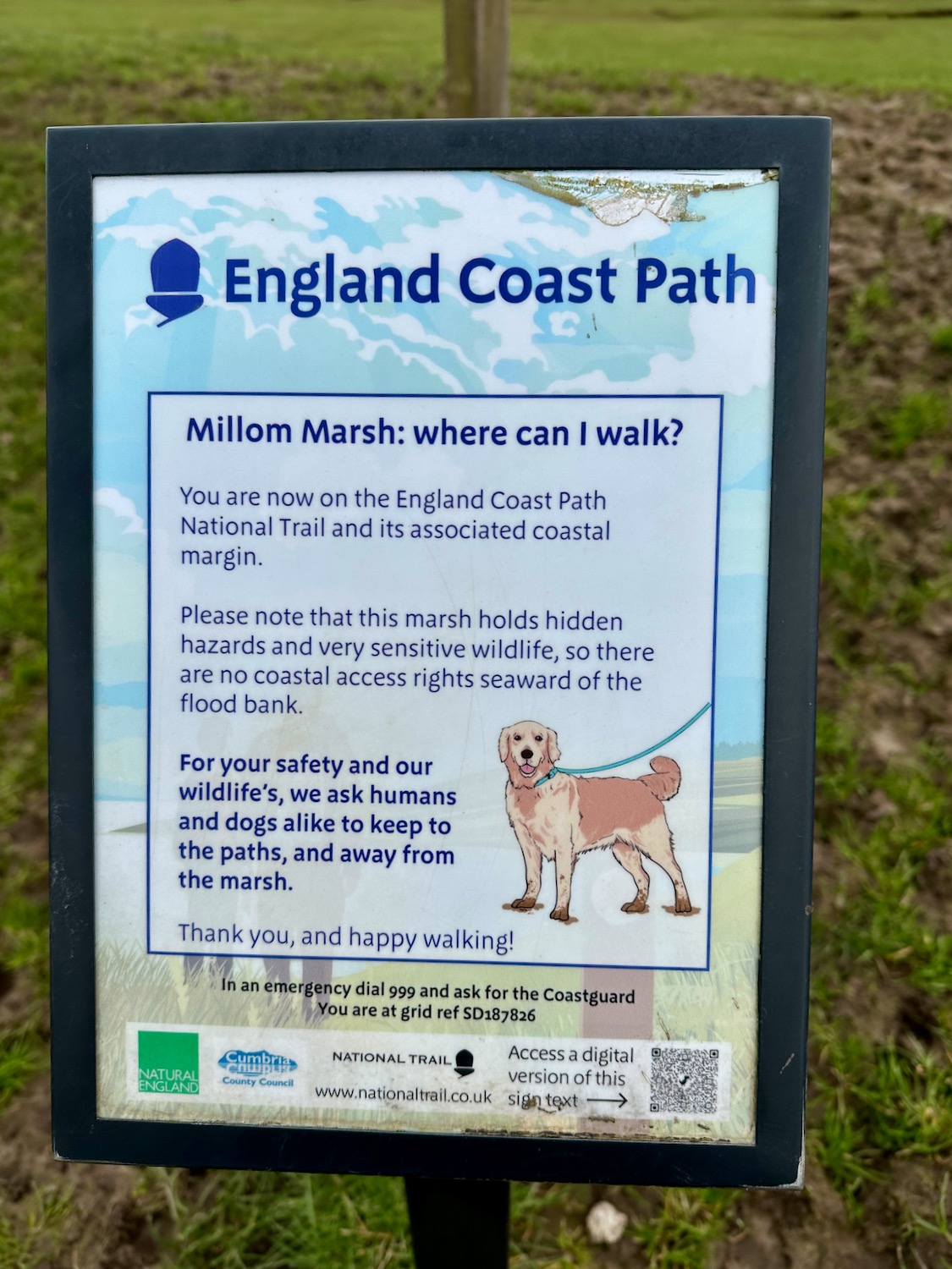 The map and signs now show us that we have suddenly joined the King Charles III England Coast Path to take us through Millom Marsh to Millom. This path has been celebrated quite recently as an UNBROKEN path around the coast of England – I beg to differ and let’s leave it there.