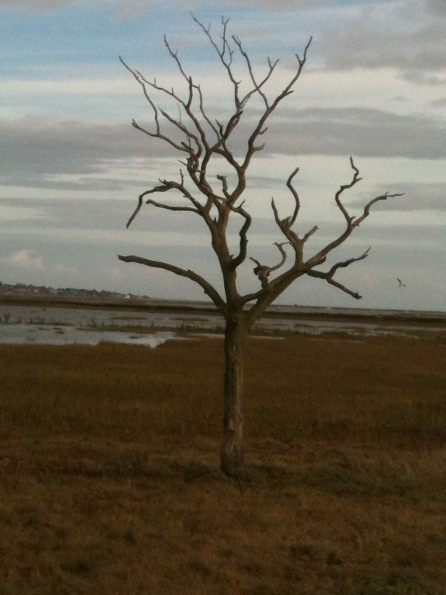 An early morning bus takes me back to Tollesbury where I push an envelope containing £10 through the door of the closed teashop. On the other side of a gate with information about Tollesbury Wick Marshes, the first part of today’s walk. The sky is grey but some weak winter sunshine lights up the far side of the marina, and walking on for a few more miles I come across an area of dead trees not unlike the ones on Southwold beach: in the same way they lift their branches in a silent entreaty to the heavens.